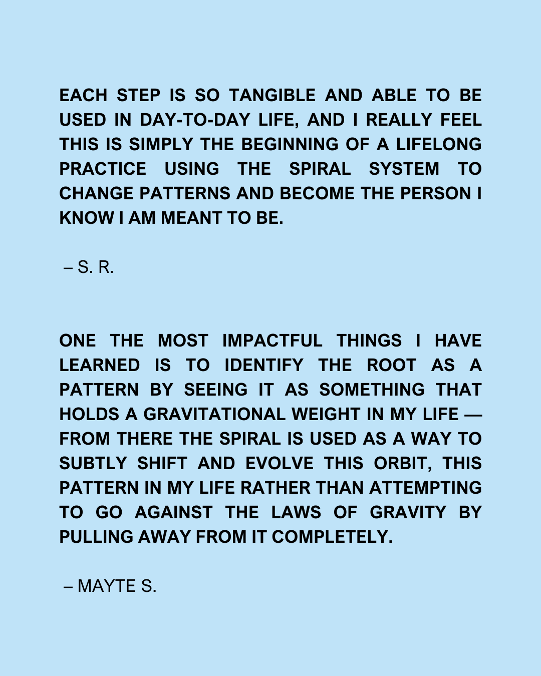 The premise of the Spiral System is that just as planets orbit stars in space, so patterns repeat in your life due to unconscious core beliefs.